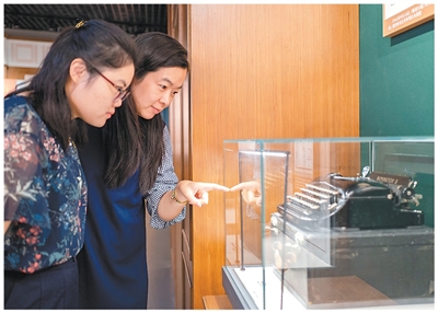 2025年9月19日,上海淞沪抗战纪念馆,观众正在参观中国检察官向哲濬参加东京审判时所使用过的老式打字机。王 初摄(人民视觉)